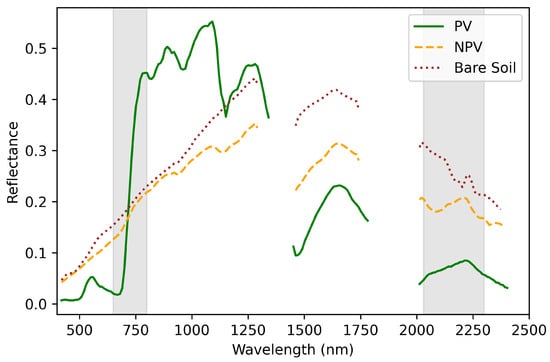 The AutoMCU capitalizes on two spectrum regions proved in previous studies [,] to strongly differentiate the spectral characteristics of PV, NPV, and BS, illustrated in Figure 3, which depicts the distinctions among the spectral characteristics of PV, NPV, and BS. The shaded region corresponds to the range of wavelengths employed by the AutoMCU algorithm in the present study for quantifying the fractions of each cover type within mixed pixels.