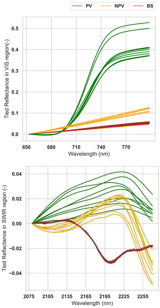 As explained above, the SWIR-2 (2100–2400 nm) region is dominated by foliar water absorption in PV spectra, whereas drier NPV vegetation allows the absorption features of organic compounds like cellulose and lignin to stand out at 2100 and 2300 nm. In contrast, BS spectra typically have a hydroxyl absorption feature at 2200 nm. The visible-to-NIR range (600–800 nm) contains the red edge feature of green vegetation. In general, reflectance decreases with increasing organic matter and/or water content in vegetation or soil. Due to the unique spectral shape of green vegetation in the red edge, this region provides good separation between PV from both NPV and BS [].