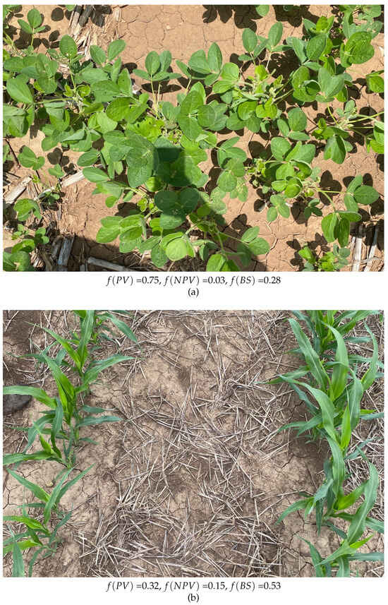 AutoMCU estimates of the endmember cover fractions for two example sample points in the studied field locations: (a) soybean in Iowa; (b) sorghum in Kansas.