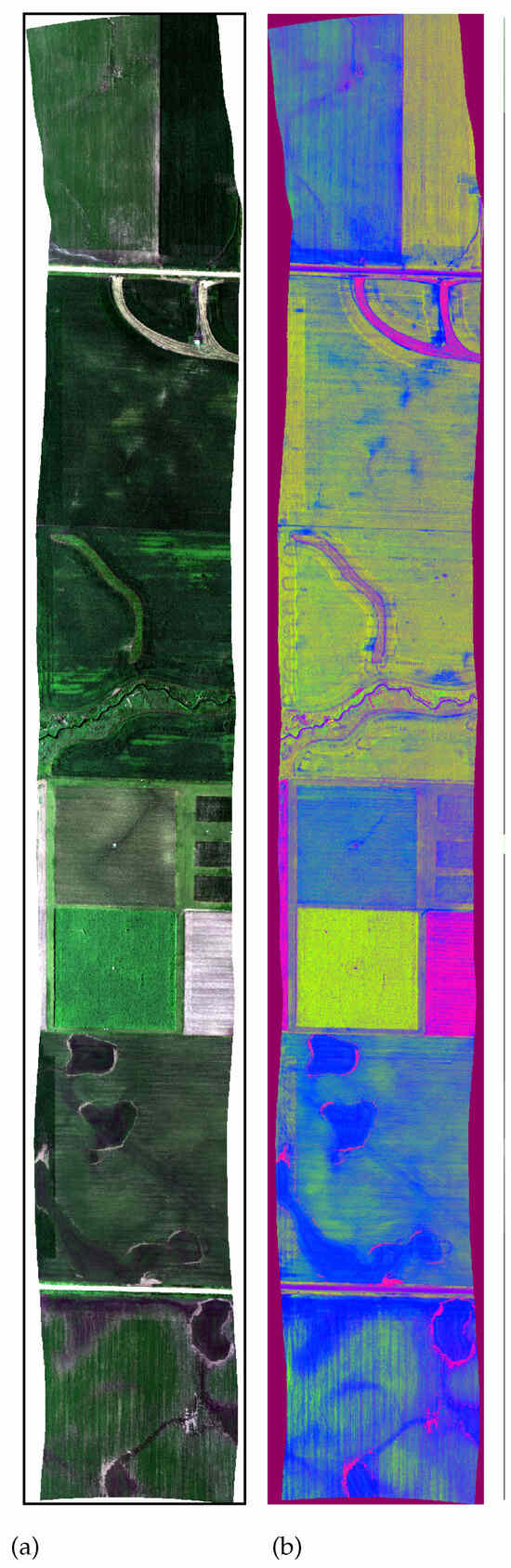 An example of the flight line images from the Iowa farm used in the study: Maps are (a) the GAO VSWIR reflectance image showing bands for red (650 nm) and green (550 nm), and blue (460 nm) and (b) the resulting fractional cover map from the AutoMCU algorithm as a false-color representation using red = non-photosynthetic vegetation, green = photosynthetic vegetation, and blue = bare soil.