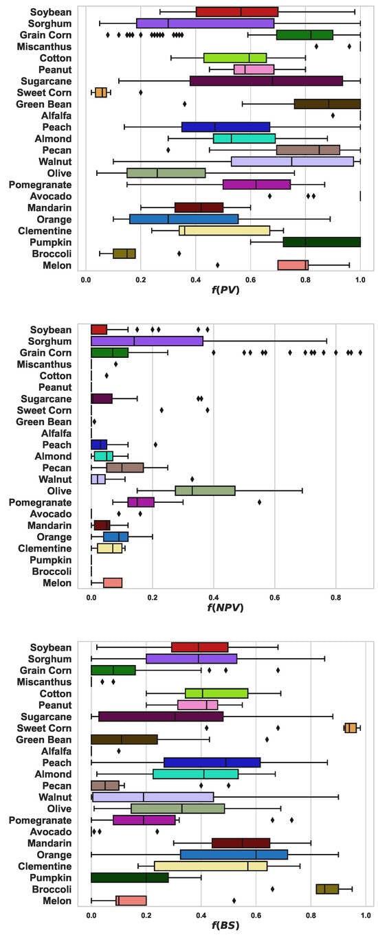 We found that cover fractions of each of the three endmembers varied by crop species and location (Figure 7). The highest median values for were found in fields planted with green bean, pecan, and grain corn crops. Similarly, olive had the highest median value for , and sweet corn and melon shared the highest median values of . Among the crops, grain corn showed the largest diversity of cover values, largely due to crop age as a result of it being planted across all three field campaigns. Approximately 21% of the pixels exhibited exceeding 0.9, while 62% of the pixels showed surpassing 0.5. Conversely, the analysis revealed that values exceeding 0.5 were observed in only 5% of the pixels, primarily concentrated in grain corn farms. Moreover, approximately 20% of the pixels displayed values surpassing 0.5, with sweet corn and sorghum crops being the primary contributors to this category.