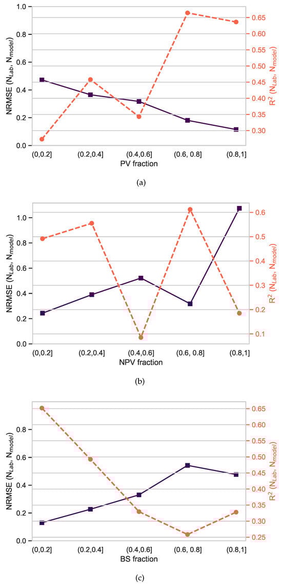 The performance of the PLSR N content model was strongly affected by variations in the proportional cover of the three endmembers, PV, NPV, and BS. As PV cover decreased from >80% to <20%, values declined from 0.64 to 0.03 and decreased from 0.46 to 0.11 (Figure 8a). This was the expected result since PV corresponds to the photosynthetically active plant material that is more likely to accumulate nitrogen. However, no relationship was found between NPV fraction variations and PLSR model performance (Figure 8b). In parallel, a decrease in BS fraction was associated with an increase in model performance (Figure 8c), with the sharpest reduction in , occurring with BS between 0.6 and 0.8. Generally, as increased, values also increased except for the values within the last range (0.8, 1]. The obtained results in this study support the findings of the previous research conducted in [], which focused on investigating the influence of the Normalized Difference Vegetation Index (NDVI), a vegetation metric loosely correlated with PV fraction, on the accuracy of nitrogen estimation using the PLSR method.