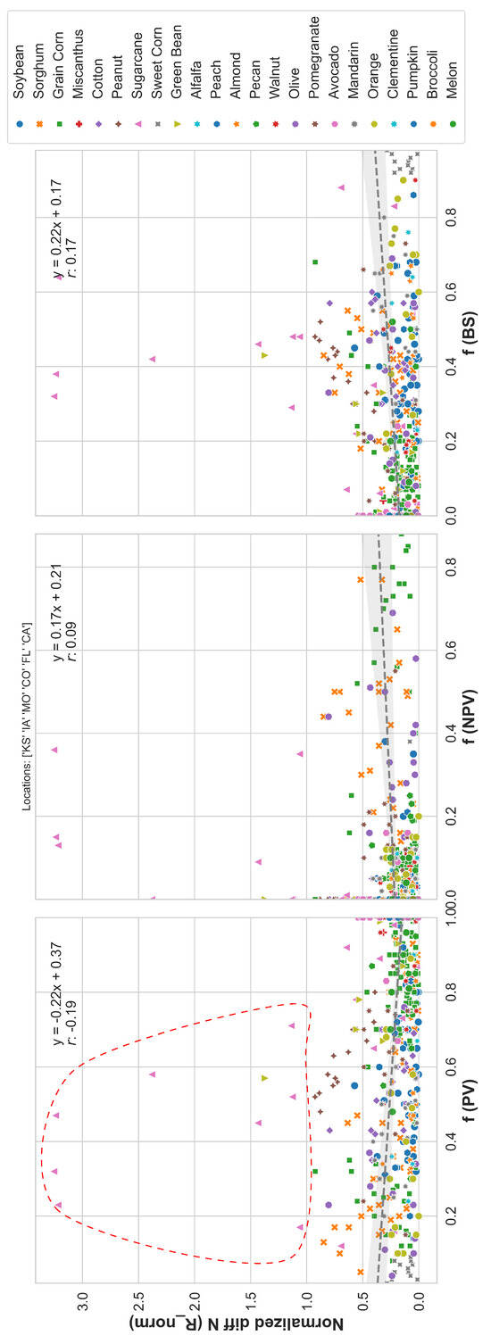 We were unable to identify a pattern between crop species and (colors/shapes in Figure 9). The same general trend was dominated by cover fractions rather than any species-specific differences in N allocation, indicating that the fitted model found spectral features showing N response independent of species. The impact of the cover fraction on Rnorm highlights the importance of accounting for vegetation cover when estimating crop nutrient content from spectral reflectance, can significantly impact the spectral response of pixels over agricultural lands, while significant values of lead to errors in the estimation of crop nutrient content from spectral data.