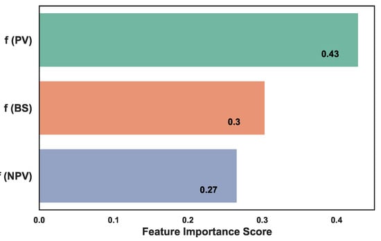 To find the relative feature importance of , , and on estimating , an RF model was trained and tested over the dataset. After the cross-validation analysis, we found that the best candidates for n-estimator, max-tree-depth, min-sample-split, and min-sample-leaf were 300, 70, 10, and 5, respectively. The factor importance values revealed that the PV value had the strongest effect on predictions with a score of 0.43 (Figure 10). The next important feature was BS, with a score of 0.30. Finally, NPV was the least important factor, with a score of 0.27, supporting the earlier result that NPV had the lowest correlation with (Figure 9). The elevated feature importance scores of PV and BS suggest that these factors exert a more substantial influence on nitrogen content estimation from a mixed pixel than NPV. Increasing BS had a stronger effect on model performance than increasing NPV in multiple tests, suggesting the problem might have less to do with the addition of confusing spectral features than a simple reduction in features important to N retrieval.