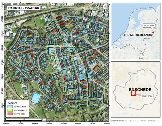 The study area of Stadsveld–‘t Zwering, located in the southern urban area of Enschede, The Netherlands, covers an area of around 153 hectares. The dataset contains 1972, 123, and 370 building samples for training validation and testing, randomly split. The extent and distribution of the building’s samples are shown in Figure 1.