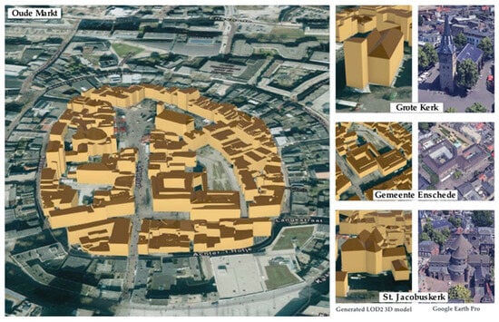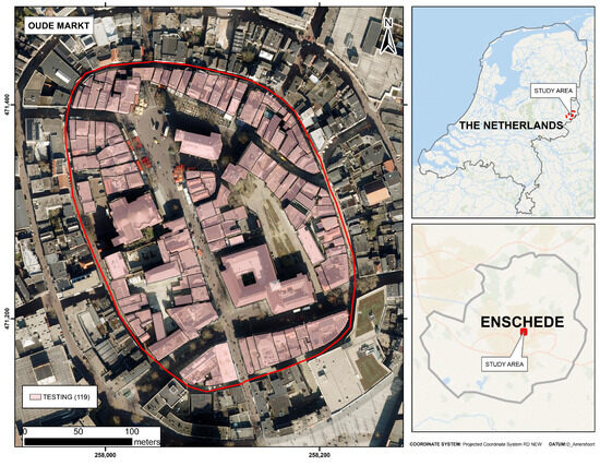 The study area of Oude Markt, located in the central urban area of Enschede, The Netherlands, covers an area of around 6 hectares. The dataset contains 119 building samples for testing the whole workflow. The extent and distribution of the building’s samples are shown in Figure 2.
