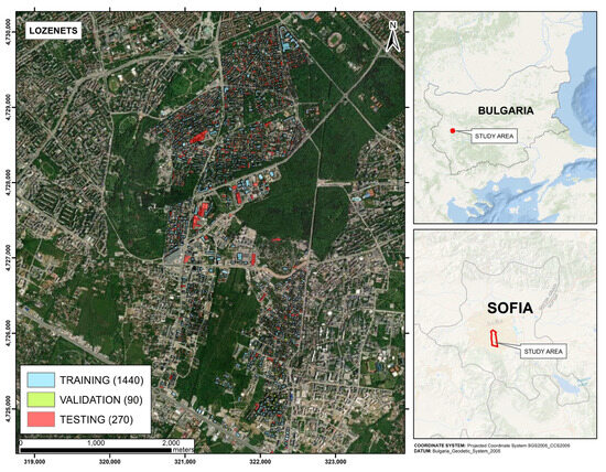 The study area of Lozenets, located in the urban area of Sofia, Bulgaria, covers an area of around 812 hectares. The dataset contains 1440, 90, and 270 building samples for training, validation, and testing, randomly split. The extent and distribution of the building’s samples are shown in Figure 3.