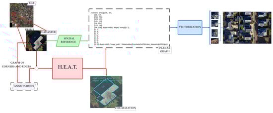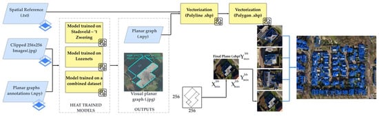 Furthermore, reference training data are essential to generate the training data for the HEAT model, which includes cropped images of the building samples and their associated planar graph. Building image samples are generated in .jpg format alongside the planar graphs for each building sample, considering the necessary resizing from real-world coordinates to the 256 × 256 image coordinates. Figure 6 shows the overall workflow of the data preparation process.