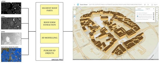 The aim of this 3D modeling process is to use the extracted vector roof output from the remotely sensed data and use the building footprints to reconstruct a full 3D building model at LOD2. This process aligns with the 3D city modelling methodology shown in the 3DBasemap extension of the commercial GIS software ArcGIS. The proposed methodology involves a multistep procedure that integrates various GIS tools to combine the inner roof planes, digital surface model (DSM), digital terrain model (DTM), and normalized digital surface model (nDSM), and subsequently enables the creation of 3D building objects at LOD2.