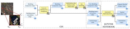 The entire data preparation process is executed using a combination of GIS software tools and Python libraries comprised in a Jupyter Notebook with Python 3.8. The information regarding the coordinate reference system of the used bounding box for each building sample necessary for resizing from real-world coordinates to image coordinates is stored in a text file per image building sample. This information is crucial for mapping the inner roof planar graph delineated on each building image sample to real-world coordinates.