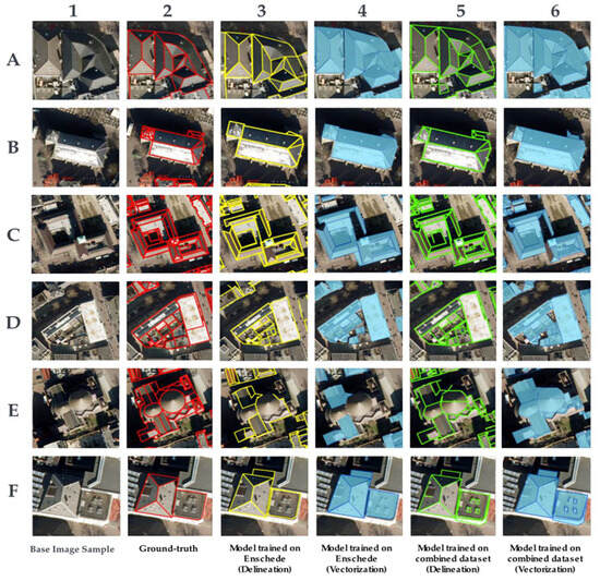 As shown by the observations in Sample F6 in Oude Markt and Row F in Lozenets (Figure 10), the output quality depends on the input data quality. In these cases, the trained model misinterpreted the building facades as part of the interior roof planes. This misconception is attributed to the building samples’ tilt of the aerial picture, which allowed some facade planes to be visible in the image samples.