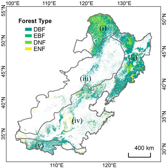 With a large area of natural secondary forest, the northeast forest region (Figure 1) is the largest forest region in China, accounting for one-third of the total national forest area [20]. It has a temperate monsoon climate with concurrent rainfall and heat [21]. The average annual precipitation is 543 mm, and the average annual temperature is 6.3 °C. The northeast forest region provides various ecosystem services, such as water conservation, soil retention, and climate regulation, thus playing a vital role in the national ecological security framework [22]. In addition, it is an important carbon sink, contributing more than 20% of China’s forest carbon sequestration [23]. To protect and enhance the ecological services of the northeast forest area and improve the regional ecological environment, a series of ecological restoration projects have been implemented. These include the Three-North Shelterbelt Project, Natural Forest Conservation Project, and Beijing–Tianjin Sand Source Control Project [24]. According to the classification by Fang et al. [25], the study area encompasses five vegetation zones, e.g., a cold temperate conifer forest zone (i), temperate conifer and broadleaf mixed forest zone (ii), temperate grassland region (iii), warm temperate deciduous broadleaf forest zone (iv), and subtropical evergreen broadleaf forest zone (v) (Figure 1). The main patterns of forest degradation that occur in the northeast forest region include fire, drought, and pest infestation [22]. With climate change, the frequency and intensity of forest degradation is expected to increase [26].