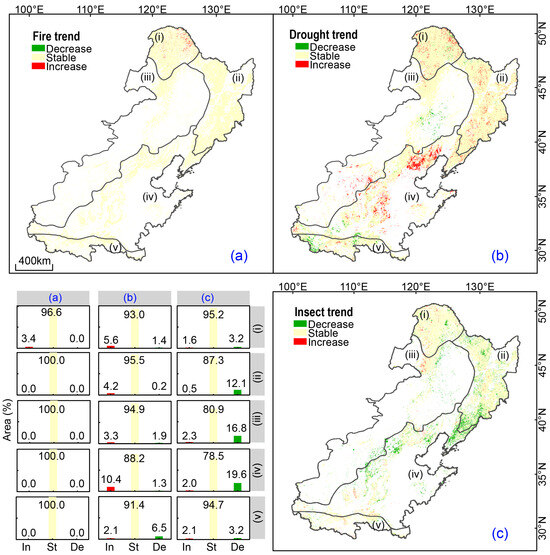 Through the past two decades, the trend of the degradation index for forest fires remained largely stable, with only 3.4% of the cold temperate conifer forest zone showing an increasing trend in forest fire disturbance (Figure 4a). The trend of forest drought was predominantly stable, spatially concentrated mainly in the warm temperate deciduous broadleaf forest zone, temperate grassland region, and cold temperate conifer forest zone, with proportions ranging between 93.0% and 95.5%. The subtropical evergreen broadleaf forest zone exhibited the highest percentage decrease in drought trend, reaching 6.5%; the warm temperate deciduous broadleaf forest zone showed the highest percentage increase in drought trend, reaching 10.4% (Figure 4b). The trend of forest pest infestation was primarily stable and spatially distributed across the cold temperate conifer forest zone, subtropical evergreen broadleaf forest zone, and temperate conifer and broadleaf mixed forest zone, with proportions between 87.3% and 95.2%. The warm temperate deciduous broadleaf forest zone had the highest percentage decrease in pest infestation trend, at 19.6%, and the temperate grassland region had the highest increase in pest infestation trend, at 2.3% (Figure 4c).