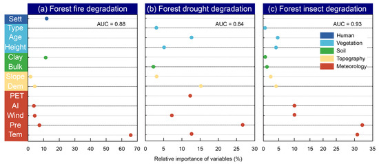 The relative contributions of predictors in typical forest degradation due to fire (a), drought (b), and insect (c).