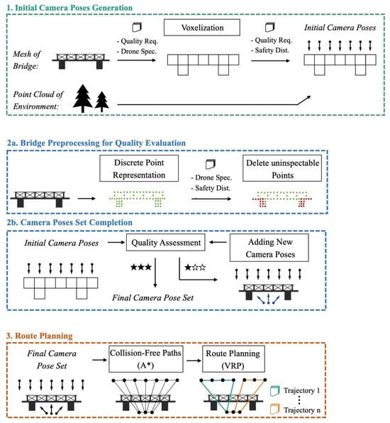 Figure 1 delineates the procedural framework of the proposed methodology. First, a voxelized representation of the bridge is calculated based on the required quality standards, both in terms of image quality and the overlap factor between individual images. Based thereon, a first set of camera poses is generated, elaborated in Section 2.2.