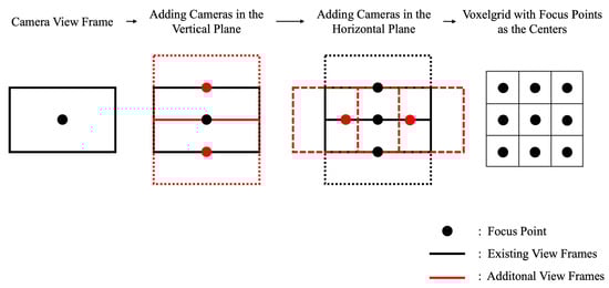 Methodical approach for calculating the voxel size. Camera view frames are vertically positioned with the required overlap, and horizontally placed at equal intervals. The camera focal points are set at the voxel center.