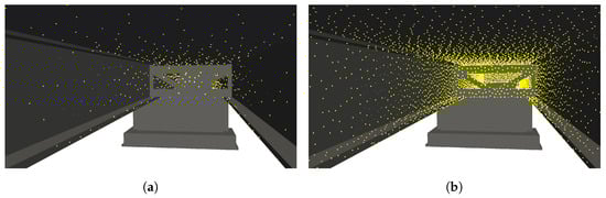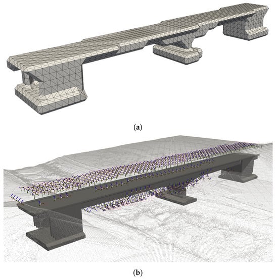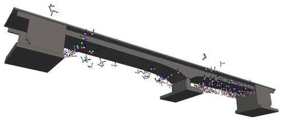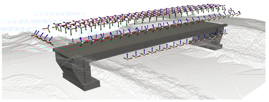 With the targeted GSD of 1 mm/pixel, a voxel size of 1.71 m was calculated using Equations (1), (3) and (4). The resulting mesh of the bridge is depicted in Figure 7, alongside the mesh after employing the marching cubes algorithm [] on the voxelized mesh. By applying the algorithm and thereby smoothing the edges of the bridge representation, additional camera poses are placed along the edges. In Figure 8 the generated camera poses are displayed, with one camera pose per voxel face. Camera poses that do not adhere to the required safety distances from the bridge and its surroundings have been excluded. The environment surrounding the bridge is represented by a sparse point cloud. Large objects, such as trees, were removed from the representation to make the camera poses more easily visible in the image but were still considered in the calculations.