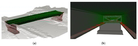 Not visible surface points of the pedestrian bridge marked red in (a) and deleted from the set of points. In (b), the underside of the bridge is shown, with non-inspectable points due to safety distances in red.