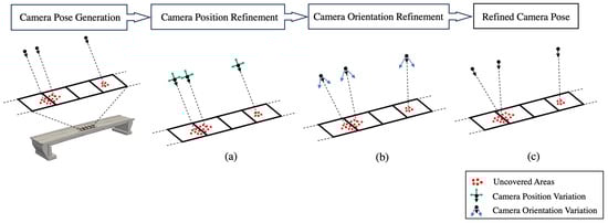 For areas where the coverage of the bridge is not yet complete, new camera poses are generated. The process is divided into three stages: grouping of points, with a new camera pose added for each group. Subsequently, the camera poses are improved in their position and lastly orientation. The process is schematically depicted in Figure 5.