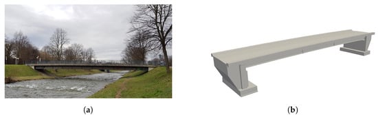 An image of the bridge used in this study in (a). Pedestrian bridge over the Dreisam river in Freiburg, Germany with a length of 40 m. The model of the bridge obtained from [] can be seen in (b). Parts of the bridge’s foundation are not visible as they are located underground.