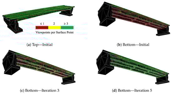 The inability to achieve 100% coverage after more than ten iterations is attributed to the fact that some inspectable points cannot be captured from multiple distinct viewpoints. As described in Section 2.3.1, points are considered inspectable if they can be observed from at least one camera position, but for reconstruction, at least two images from different perspectives are required. Since the incremental gain in coverage diminishes significantly with each iteration, while the number of added cameras increases disproportionately at a certain point, it is advisable to terminate the algorithm at an appropriate juncture. For this bridge, the computed viewpoint set after five iterations was chosen as the final set, as the improvement in the covered area in subsequent iterations was less than one percentage point.