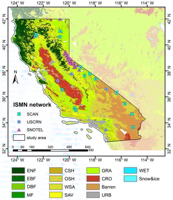 The study area, land cover types, and locations in the three ISMNs (i.e., SCAN, SNOTEL, and USCRN) used for validation. The land cover classification is obtained from the MODIS IGBP (International Geosphere-Biosphere Programme). Evergreen needleleaf forest = ENF, evergreen broadleaf forest = EBF, deciduous broadleaf forest = DBF, mixed forest = MF, closed shrubland = CSH, open shrubland = OSH, woody savanna = WSA, Savanna = SAV, grassland = GRA, cropland = CRO, barren = Barren, urban and built-up = URB, permanent wetland =WET, and permanent snow and ice = Snow&ice.