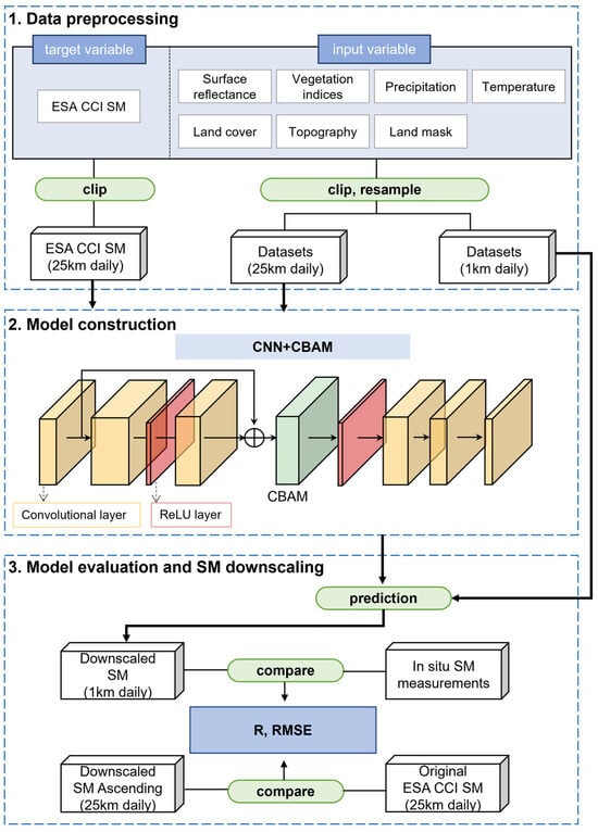 A flowchart of the ESA CCI SM spatial downscaling methodology.
