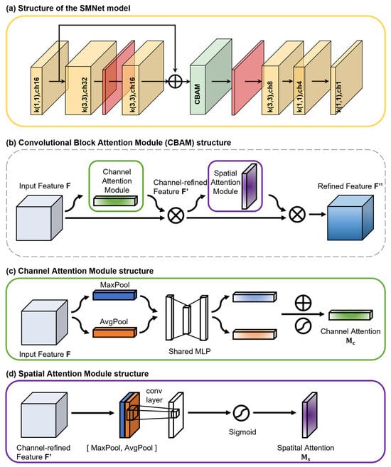The CNN model structure. (a) The structure of the SMNet model. The yellow and red blocks represent convolutional layers and ReLU layers, respectively, while the green block signifies the Convolutional Block Attention Module (CBAM). Convolutional layer notation: k (X1, X2) de-notes kernel sizes of X1 and X2, while chY represents the number of channels as Y. (b) The CBAM structure, (c) channel attention module structure, and (d) spatial attention module structure.