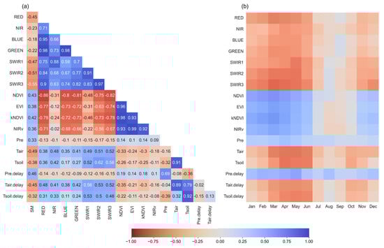 The correlations between the input variables and SM. (a) A heatmap of the annual correlation between the variables and ESA CCI SM, (b) a time series of the monthly correlation between the input variables and SM. Precipitation = Pre, precipitation delayed by one day = Pre.delay, mean air temperature = Tair, mean air temperature delayed by one day = Tair.delay, mean soil temperature = Tsoil, and mean soil temperature delayed by one day = Tsoil.delay.