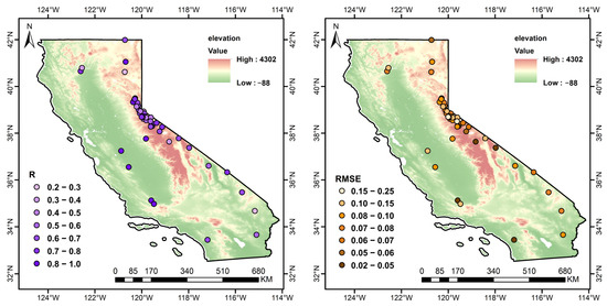 The downscaled SM data at 1 km resolution are additionally validated using in situ SM data collected from the ISMN network from 1 May to 30 September 2019–2021. Figure 7 displays the spatial distributions of the R and RMSE values for all in situ SM sites. The results reveal that over 64% of the sites observe R values higher than 0.60, and more than 53% obtain RMSE values below 0.08 m3/m3. Meanwhile, high R values are mainly found in most regions of California, except for a few sites near the Sierra Nevada region.