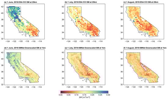 The original ESA CCI SM data (a–c) and the downscaled SM data (d–f) for 1 June, 1 July, and 1 August 2019, respectively.