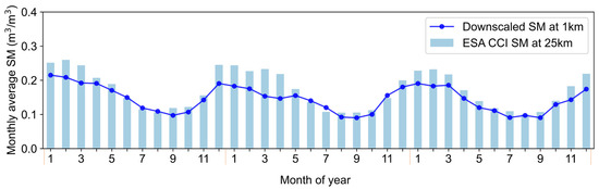 Considering the good performance of the SMNet model in terms of spatial coverage, we further validate the performance of the SMNet model in the temporal extrapolation. Here, we run the SMNet model during the non-growing season and compare the monthly average ESA CCI SM and downscaled SM data over the time period from January 2019 until December 2021. We aggregate the daily SM data at the monthly scale, and Figure 9 presents the monthly time series. As time changes, SM values display a pronounced seasonal dynamic, characterized by high SM values during the winter months and low SM values during the summer months. In comparison to the original ESA CCI SM data, the downscaled SM values exhibit systematic underestimation, especially during the winter season. The gap between the original ESA CCI SM and downscaled SM data is small during the growing season (i.e., June, July, and August), and SM reaches extremely low values in summer. Generally, the downscaled SM data illustrate a consistent seasonal variation with the original SM data, although there is relatively obvious underestimation in winter.
