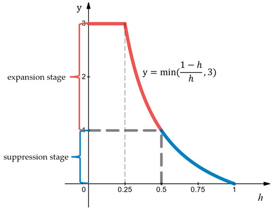 Dynamic adjustment curve varying with h. The red segment indicates the expansion stage, while the blue segment indicates the suppression stage.