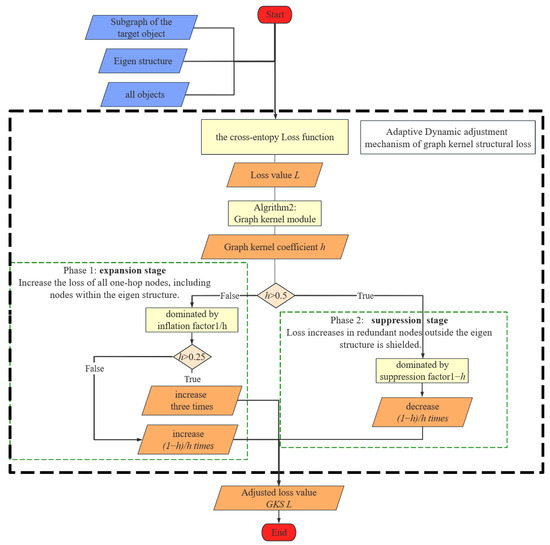 From Figure 3, it can be visually observed that the dynamic adjustment curve can be divided into two stages: expansion and suppression. When < 0.5, it is the expansion stage; when > 0.5, it is the suppression stage. During the expansion stage, to limit the expansion effect, when < 0.25, the expansion effect is restricted to 3. Next, the adaptive dynamic adjustment mechanism of GKS loss and the role of graph kernel coefficient in detail is shown in Figure 4.