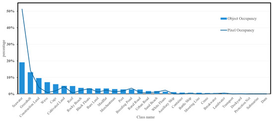 Due to the characteristic of the nearshore dataset, which predominantly consists of marine scenes, seawater is one of the main classes within the marine scene. As depicted in Figure 5, seawater accounts for the highest pixel occupancy among all classes, with a pixel area of approximately 90 million and its pixel occupancy reaching approximately 51.2%. In contrast, tail classes such as mooring line and protection net exhibit pixel occupancy all below 0.1%, with object occupancy in these classes measuring below 0.02%. This indicates an imbalance in the distribution of samples among classes in the dataset, where, apart from the samples in the head classes, the tail classes of samples are insufficient, with most samples concentrated in head classes. Therefore, it can be concluded that the experimental dataset belongs to a long-tailed distribution.