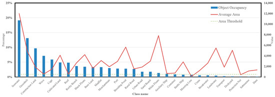 The features of small objects will be assimilated by the features of large objects after multiple layers of convolution. Figure 6 describes the distribution of object occupancy and the average object size for each class. Hence, this experiment mainly focuses on applying subsequent information enhancement to classes with a weak proportion of objects and small average object sizes. In this study, classes with object occupancy less than 1% and average object area less than 500 are selected as the target tail classes for this experiment: protection net and mooring line. The remaining classes are referred to as the head classes.
