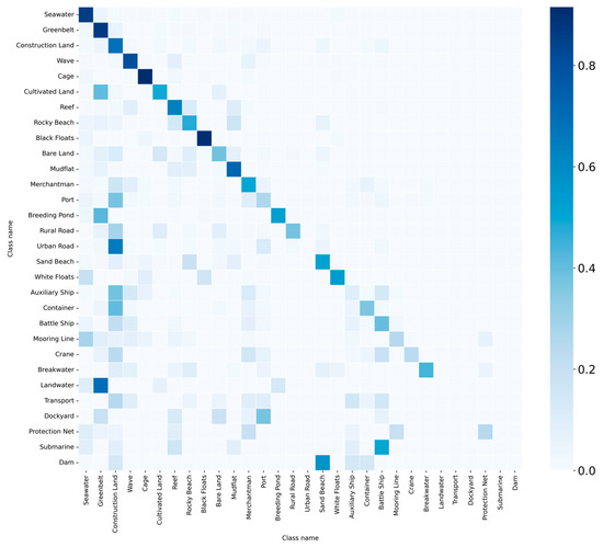 Confusion matrix of the baseline model. The confusion matrix presents the names of classes along both its horizontal and vertical axes. To enhance the graphical representation, the number of objects belonging to each class is normalized.