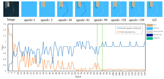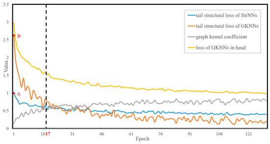- Suppression stage: After the fifth epoch, the graph kernel coefficient is greater than 0.5 and gradually approaches 1, and the tail structural loss enters a suppression stage. The kernel graph coefficient exhibits fluctuation during training, specifically dipping below 0.5 in epochs 27, 31, and 43.