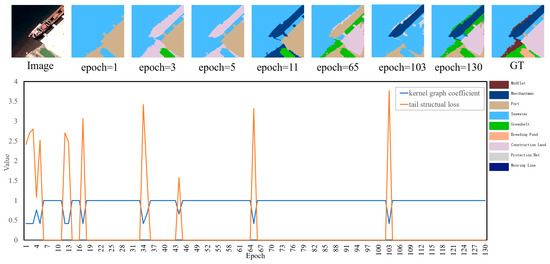 Sample 2, identical to Sample 1, also follows the adaptive dynamic adjustment mechanism. In Sample 2, the central object of the tail class is the mooring line object. The prediction result for the 11th epoch accurately identifies the mooring line object and its neighboring nodes (e.g., merchantman and seawater) as they belong to the eigenstructure of mooring line. However, nodes outside this structure, such as construction land objects, are not correctly classified. Despite this, as they reside outside the mooring line’s eigenstructure, the graph kernel coefficient between the neighborhood subgraph and eigenstructure attains the value of 1, suppressing the tail structural loss associated with redundant nodes.