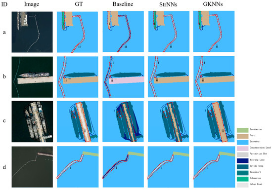 In Sample c, StrNNs corrects baseline misidentifications of seawater objects i as mooring lines. GKNNs further improves the mooring line identification compared to StrNNs and achieves better recognition of port objects ii, which are crucial in the eigenstructure of mooring line.