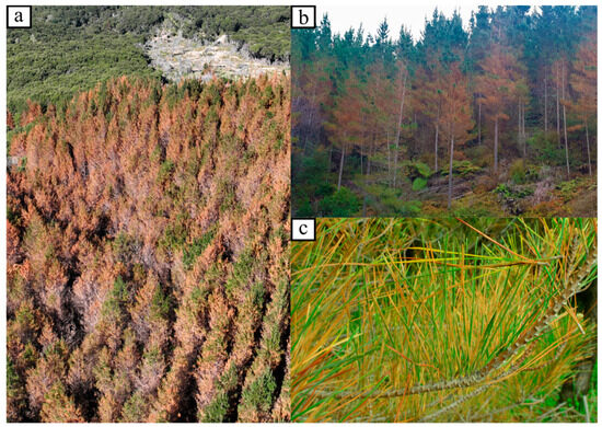 - Mantas, V.; Fonseca, L.; Baltazar, E.; Canhoto, J.; Abrantes, I. Detection of tree decline (Pinus pinaster Aiton) in European forests using Sentinel-2 data. Remote Sens. 2022, 14, 2028. [Google Scholar] [CrossRef]