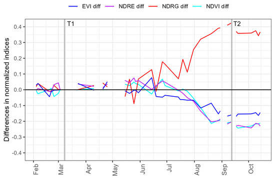 Changes in differences of four vegetation indices from a baseline during March 2023 (T1) for an area that showed RNC expression in September 2023. The four indices used to determine these differences were extracted using Sentinel-2 2A time-series data, and included the Enhanced Vegetation index (EVI), Normalized Difference Red Edge (NDRE), Normalized Difference Red/Green Index (NDRG) and Normalized Difference Vegetation Index (NDVI). The vertical lines Time 1 (T1) and Time 2 (T2) represent acquisition dates that included, respectively, a baseline (no expression) and the time of maximum RNC expression.