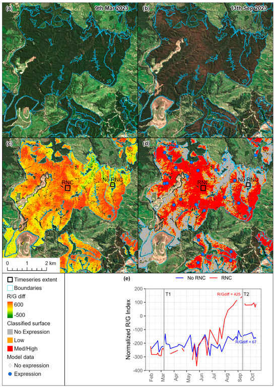 Sentinel-2 images acquired on (a) 9 March (T1) and (b) 13 September 2023 (T2). Also shown is (c) R/Gdiff determined from these images and (d) R/Gdiff values classified into three classes. For selected areas with no expression and RNC expression (shown in (c,d)), the R/Gdiff calculation is displayed in panel (e) with R/Gdiff for both classes determined as the difference in R/G between Time 2 (T2) and Time 1 (T1).