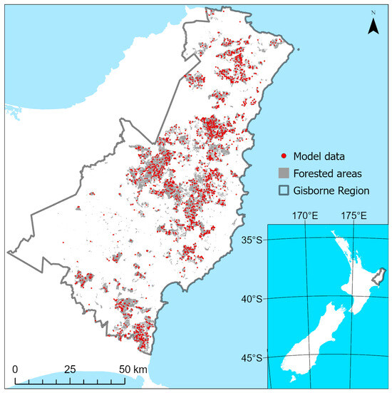 Distribution of R/Gdiff plots (red points) extracted from within the radiata pine forested areas (grey area) of the Gisborne region.