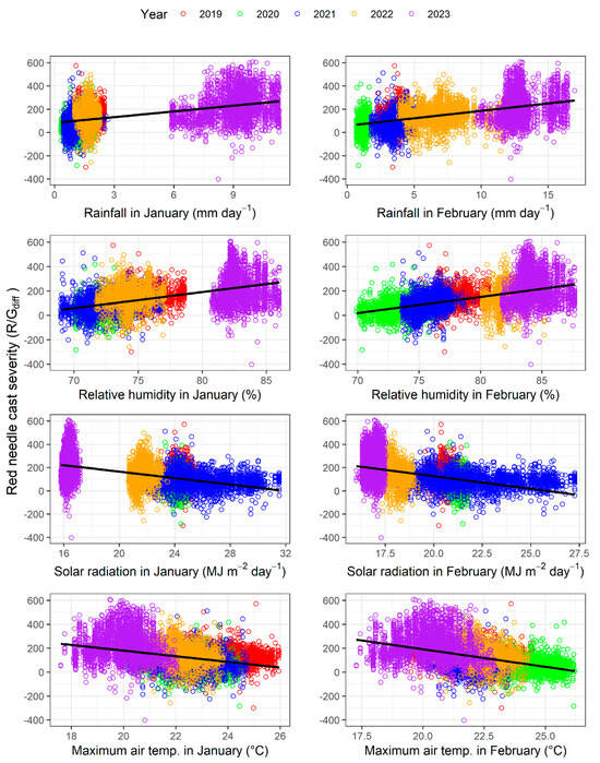 The relationships between the strongest four weather variables and R/Gdiff during January and February are shown in Figure 8. Linear lines were fitted to these data, and equation coefficients and the coefficient of determination are given in Table A1. During both months, R/Gdiff was positively related to rainfall and relative humidity and negatively related to solar radiation and Tmax. The ordering of R/Gdiff values between the years was relatively consistent with the values for these weather variables. For example, the extracted plots for 2023, which was the year of the worst outbreak, had very high rainfall and relative humidity and very low solar radiation and Tmax, with these differences being most marked in January (Figure 8). Similarly, for 2022, which had the second highest values of R/Gdiff, the values for these four variables were generally similar but not as extreme as for 2023, particularly for the four February variables. In contrast, the low values of R/Gdiff in 2020 were associated with low values of rainfall and relative humidity and high values of solar radiation and Tmax, with these patterns being particularly evident during February (Figure 8).