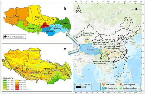 The location and topography of study areas: (a) the distribution of study areas in China, including the location of new energy bases, which are planned to deliver energy to other provinces; (b) the distribution of administrative areas in Xizang province and the location of 38 meteorological stations used in this study; (c) the distribution of the topography and major mountain ranges in Xizang province (the elevation map was generated from the ASTER GDEM 30M resolution digital elevation data of the Geospatial Data Cloud).