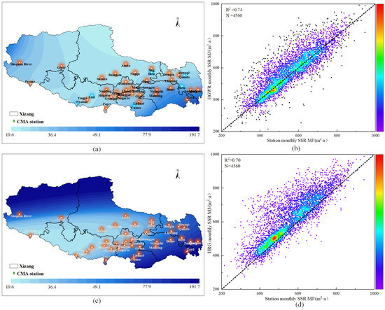 Difference maps of monthly SSR (MJ/(m2·month)) from (a) HGWR and (c) HRG with stations in 2001–2010. Comparison of monthly SSR from (b) HGWR and (d) HRG with stations in 2001–2010.