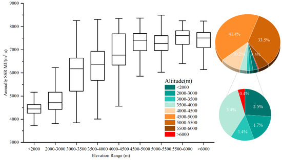 Annual mean SSR (MJ/(m2·a)) boxplots and pie chart of area distribution by elevation of Xizang.