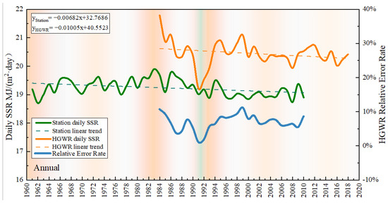 The variations of the annual mean daily SSR (MJ/(m2·day)) averaged over the Xizang region during 1960–2018 (data of HGWR is extracted at the station locations). The HGWR relative error rate is the proportion of the difference between two datasets in the station data. The orange background shading shows the occurrence and intensity of solar activity, with the green background representing the eruption of Mount Pinatubo.