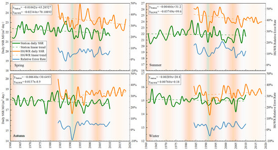 December, January, and February are considered to be winter and so on. We analyze the interannual variability of the four seasons as shown in Figure 8, where the two sets of data are more similar at the seasonal scale compared to the annual scale, with satellite data fluctuating more in magnitude. Station data show a decreasing trend in all seasons, with the most pronounced in spring. Sanchez-Lorenzo [47] found the decadal variability in spring over Europe during the period 1983–2010 is the most similar to the annual trends: the same as Xizang. HGWR behaves differently, with a decreasing trend in spring and summer and an increasing trend in autumn and winter. Based on the historical difference curves between the two datasets, it is evident that the difference between station data and satellite data fluctuates significantly during the spring and summer seasons, while it remains relatively stable during the autumn and winter seasons, with the difference and average relative error not exceeding 2 MJ/(m2·day) and 5%, respectively.